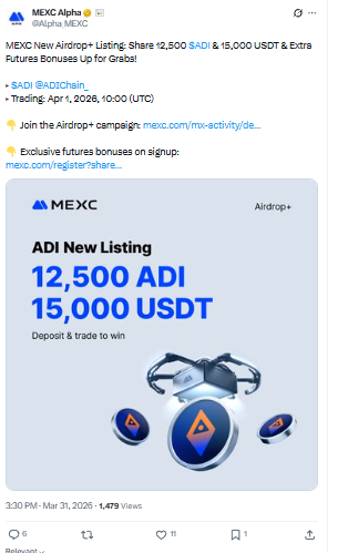क्रिप्टो एक्सचेंज MEXC ने 31 मार्च 2026 को एक नया Airdrop+ और लिस्टिंग कैंपेन लॉन्च किया है, जिसमें $ADI टोकन को प्लेटफॉर्म पर पहली बार पेश किया जा रहा है। यह कैंपेन यूजर्स को ट्रेडिंग और डिपॉजिट के जरिए रिवॉर्ड कमाने का मौका देता है। 1 अप्रैल 2026 को ADI/USDT स्पॉट पेयर के लाइव होने के साथ, यह इवेंट मार्केट में नई लिक्विडिटी और यूजर एक्टिविटी लाने की दिशा में बड़ा कदम माना जा रहा है।