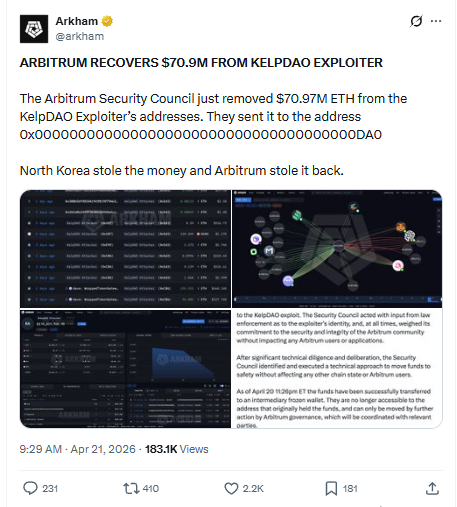 क्रिप्टो दुनिया में सुरक्षा और भरोसे को लेकर एक बड़ी घटना सामने आई है, जहां Arbitrum ने तेज कार्रवाई करते हुए एक बड़े हैक से जुड़े करोड़ों डॉलर के फंड्स रिकवर कर लिए। 18–19 अप्रैल 2026 के बीच हुए KelpDAO एक्सप्लॉइट के बाद लगभग $70.97 मिलियन (30,000+ ETH) को हैकर के कंट्रोल से निकालकर सुरक्षित वॉलेट में भेज दिया गया।