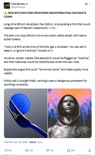 Bitcoin में eCash Fork प्रस्ताव से बड़ा विवाद, Satoshi के BTC पर बहस