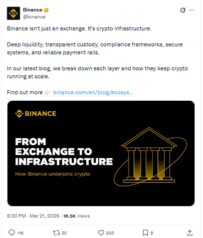 क्रिप्टो इंडस्ट्री में Binance को अब सिर्फ एक ट्रेडिंग प्लेटफॉर्म के तौर पर नहीं देखा जा रहा है। हाल ही में अपने X अकाउंट @binance पर कंपनी ने साफ किया कि वह “crypto infrastructure” के रूप में काम कर रही है,यानी एक ऐसा पूरा सिस्टम जो डिजिटल एसेट्स की दुनिया को चलाने के लिए जरूरी सभी सेवाएं देता है।