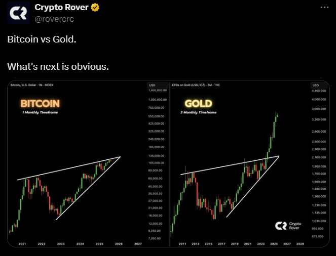 क्रिप्टो मार्केट और ट्रेडिशनल मार्केट में एक पुराना सवाल हमेशा रहता है – Bitcoin vs Gold में कौन बेहतर है? हाल ही में चार्ट्स ने इस बहस को फिर से गर्म कर दिया है। बिटकॉइन का प्राइस पैटर्न सोने की तरह एक बड़े ब्रेकआउट के करीब दिखाई दे रहा है। इसलिए यह समय है समझने का कि 2025 में कौन आगे निकल सकता है।