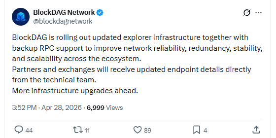 28 अप्रैल 2026 को BlockDAG Network ने अपने इकोसिस्टम को और मजबूत करने की दिशा में एक अहम कदम उठाया है। आधिकारिक घोषणा के जरिए कंपनी ने बताया कि मेननेट लॉन्च के बाद नेटवर्क की स्थिरता और भरोसे को बढ़ाने के लिए नए Infrastructure Upgrades लागू किए जा रहे हैं।
