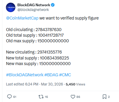 क्रिप्टो मार्केट में तेजी से चर्चा में बना BlockDAG Network (BDAG) एक बार फिर सुर्खियों में है। 30 मार्च 2026 को प्रोजेक्ट ने दो बड़े अपडेट्स जारी किए, पहला, CoinMarketCap से सप्लाई डेटा वेरिफिकेशन की रिक्वेस्ट, और दूसरा “Last 7 Days” प्रमोशन लॉन्च।
