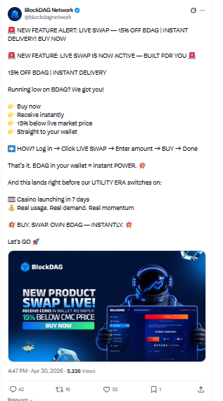 30 अप्रैल 2026 को क्रिप्टो दुनिया में एक अहम अपडेट सामने आया है, जब BlockDAG Network ने अपना नया फीचर “Live Swap” आधिकारिक तौर पर लॉन्च कर दिया। यह फीचर यूजर्स को सीधे और तुरंत BDAG कॉइन खरीदने की सुविधा देता है, वह भी बिना किसी पारंपरिक एक्सचेंज की जटिल प्रक्रिया के।