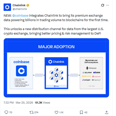 Crypto और DeFi ecosystem में एक बड़ा milestone सामने आया है। Coinbase ने 25 मार्च 2026 को Chainlink के साथ अपना नया integration announce किया है। इस partnership के जरिए पहली बार Coinbase का premium exchange data सीधे blockchain पर उपलब्ध कराया जा रहा है।