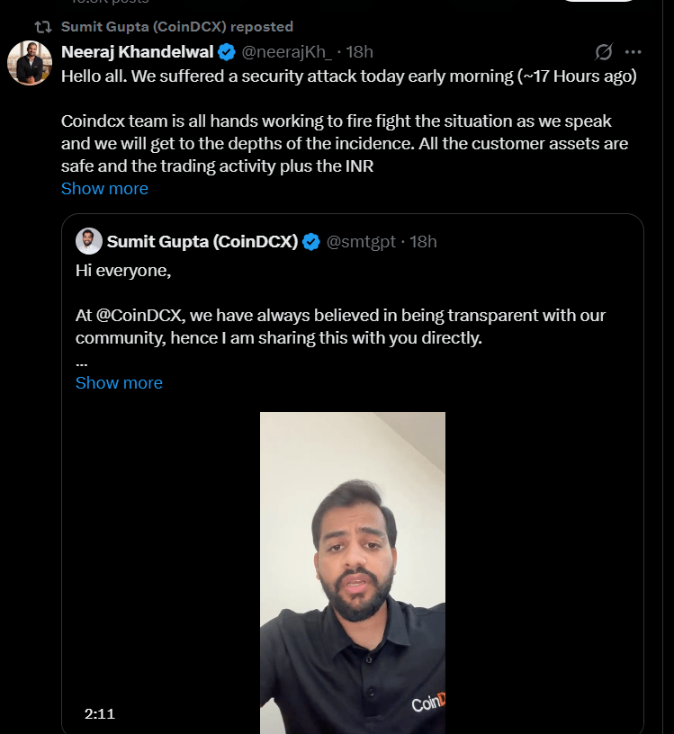 CoinDCX के Co-founder और CEO Sumit Gupta ने एक आधिकारिक X (Twitter) पोस्ट में इस सिक्योरिटी ब्रीच की पुष्टि की है। उन्होंने बताया कि: