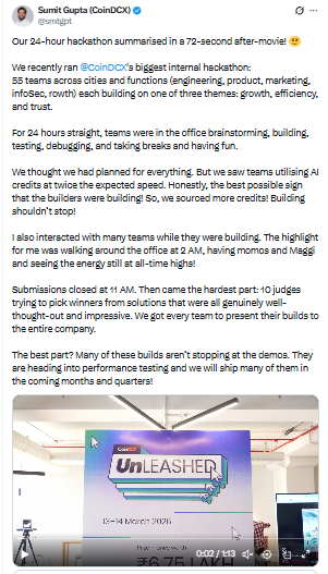 भारत के प्रमुख क्रिप्टो एक्सचेंज CoinDCX ने अपने सबसे बड़े internal हैकाथॉन “Unleashed” के जरिए innovation culture को नई ऊंचाई दी है। 6 अप्रैल 2026 को कंपनी के Co-Founder और CEO Sumit Gupta ने एक after-movie शेयर कर इस 24 घंटे के non-stop event की झलक दी।