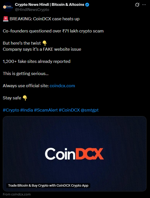 पुलिस ने इस शिकायत के आधार पर CoinDCX के co-founders को पूछताछ के लिए बुलाया। लेकिन कंपनी से जुड़े सूत्रों का कहना है कि पीड़ित ने जिस प्लेटफॉर्म का इस्तेमाल किया, वह असली CoinDCX नहीं था, बल्कि एक fake website थी, coindcx.pro, जो कंपनी के नाम और branding का गलत इस्तेमाल कर रही थी।