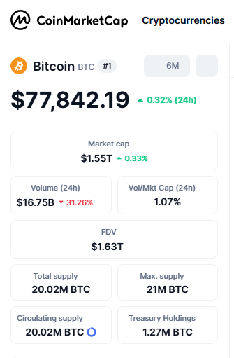 आज के कारोबार में Bitcoin लगभग $78,000 (करीब ₹73.31 लाख) के आसपास स्थिर रहा। पिछले 24 घंटों में इसमें करीब 0.66% की मामूली बढ़त दर्ज की गई, जिससे यह 11 हफ्तों के उच्च स्तर के करीब बना हुआ है। यह दिखाता है कि बाजार में भरोसा अभी भी बिटकॉइन पर बना हुआ है।