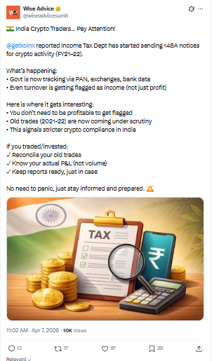 भारत में क्रिप्टो ट्रेडर्स के लिए एक अहम अलर्ट सामने आया है। Sumit Gupta से जुड़े अकाउंट के जरिए जानकारी मिली है कि Income Tax Department ने FY 2021-22 से जुड़े मामलों में Section 148A के तहत नोटिस भेजना शुरू कर दिया है। यह कदम उन निवेशकों और ट्रेडर्स को प्रभावित कर सकता है जिन्होंने उस साल अपनी क्रिप्टो आय सही तरीके से रिपोर्ट नहीं की थी।