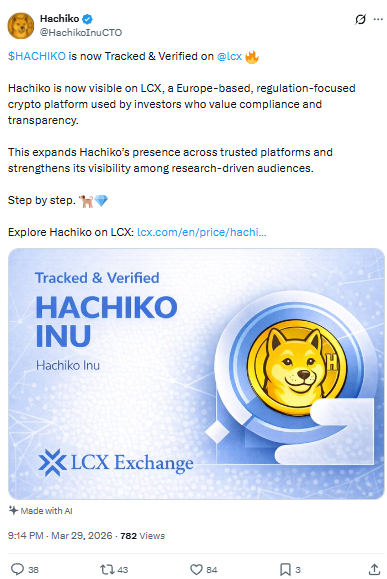 क्रिप्टो मार्केट में तेजी से उभरते प्रोजेक्ट HACHIKO ने एक और महत्वपूर्ण उपलब्धि हासिल कर ली है। 29 मार्च 2026 को प्रोजेक्ट ने घोषणा की कि अब इसका टोकन यूरोप के Regulation-Focused Platform LCX पर “Tracked & Verified” हो गया है।