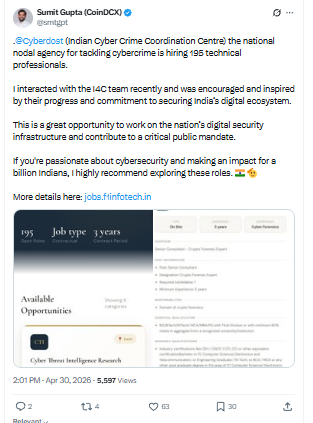 30 अप्रैल 2026 को भारत के डिजिटल सुरक्षा क्षेत्र से एक अहम अपडेट सामने आया है, जिसने युवाओं और टेक प्रोफेशनल्स के लिए नए अवसर खोल दिए हैं। Sumit Gupta ने सोशल मीडिया पर जानकारी साझा करते हुए बताया कि Indian Cyber Crime Coordination Centre, जिसे Cyberdost के नाम से भी जाना जाता है, 195 तकनीकी पेशेवरों की भर्ती कर रहा है।