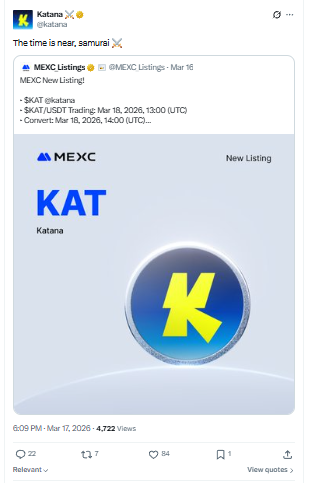 Crypto market में इस समय जबरदस्त हलचल है, और इसकी बड़ी वजह है KAT Token का लॉन्च। Katana ने आधिकारिक तौर पर घोषणा की है कि इसका token 18 मार्च 2026 को दोपहर 1:00 बजे UTC से trading के लिए लाइव होगा। Launch के साथ ही इसे Binance, KuCoin, Kraken और XT.COM जैसे बड़े exchanges पर list किया जा रहा है, जिससे market में इसकी visibility और demand दोनों बढ़ने की उम्मीद है।