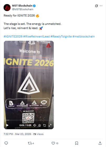भारत के उभरते Web3 ecosystem में MST Blockchain ने एक और बड़ा कदम उठाया है। 23 मार्च 2026 को कंपनी ने अपने ऑफिशियल X अकाउंट के जरिए IGNITE 2026 इवेंट की घोषणा की। “Ready for IGNITE 2026” और “Let’s rise, reinvent & lead” जैसे संदेशों के साथ यह इवेंट कंपनी की global expansion strategy का अहम हिस्सा माना जा रहा है।