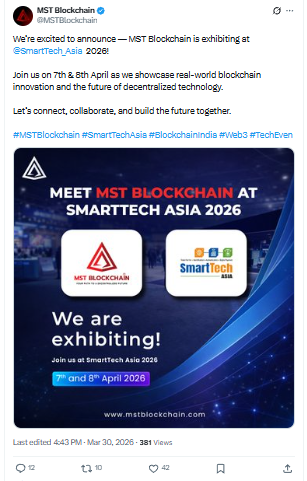 भारत के तेजी से बढ़ते टेक इकोसिस्टम में Web3 और ब्लॉकचेन टेक्नोलॉजी की पकड़ लगातार मजबूत हो रही है। इसी कड़ी में MST Blockchain ने 30 मार्च 2026 को घोषणा की है कि वह आने वाले SmartTech Asia 2026 में एग्जिबिटर के रूप में हिस्सा लेगा। यह इवेंट 7 और 8 अप्रैल को मुंबई के Jio World Convention Centre में आयोजित होगा और इसमें देश-विदेश के टेक लीडर्स, डेवलपर्स और इंडस्ट्री एक्सपर्ट्स शामिल होंगे।
