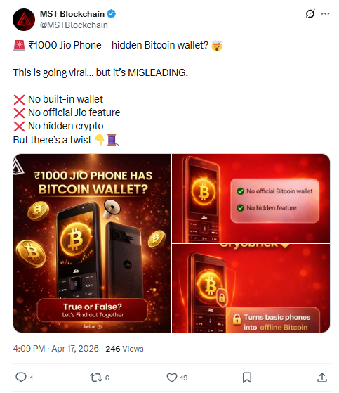 लेकिन MST Blockchain ने साफ किया कि यह पूरी तरह गलतफहमी है। कंपनी के अनुसार, Jio Phone के KaiOS आधारित सिस्टम में कोई भी crypto wallet पहले से मौजूद नहीं है। न ही Reliance Jio ने ऐसा कोई फीचर लॉन्च किया है और न ही इसकी कोई आधिकारिक घोषणा की गई है।