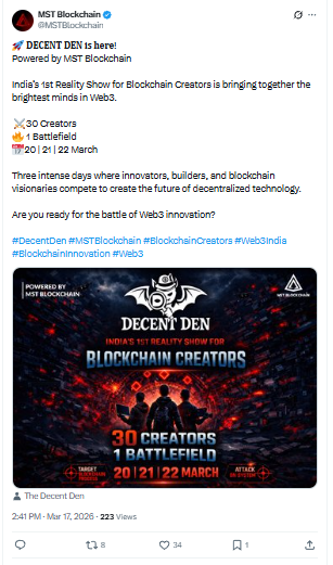 Indore में Web3 और entertainment का एक नया fusion देखने को मिलने वाला है। भारत का पहला blockchain-based creators reality show Decent Den अब MST Blockchain के साथ integrate हो गया है। इस partnership के बाद शो के कई core features जैसे voting, raids और NFTs पूरी तरह on-chain होंगे, जिससे users को ज्यादा transparent, secure और real-time experience मिलेगा।
