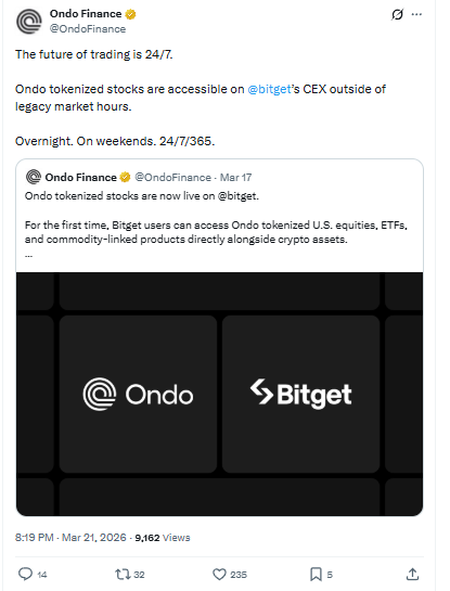 21 मार्च 2026 को Ondo Finance ने अपने फॉलो-अप पोस्ट में इस feature को highlight किया कि अब trading traditional market timings तक सीमित नहीं रही।
