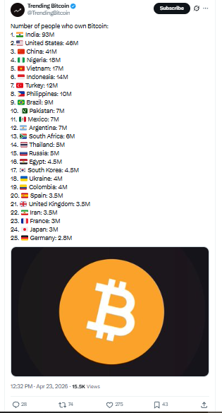 अप्रैल 2026 में सामने आई एक नई रिपोर्ट ने क्रिप्टो दुनिया का ध्यान भारत की ओर खींच दिया है। Trending Bitcoin के अनुसार, भारत अब 93 मिलियन से ज्यादा Bitcoin Holders के साथ दुनिया का सबसे बड़ा क्रिप्टो बाजार बन चुका है। Bitcoin Holders का यह आंकड़ा United States और China जैसे बड़े देशों से भी काफी ज्यादा है।