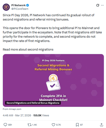 Web3 ecosystem में धीरे-धीरे progress करते हुए Pi Network ने Pi Day 2026 के बाद एक और बड़ा कदम उठाया है। 14 मार्च 2026 के बाद से नेटवर्क ने second migrations और referral mining bonuses का rollout शुरू कर दिया है।