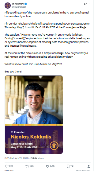 क्रिप्टो और डिजिटल पहचान की दुनिया में तेजी से बदलाव हो रहा है, और इसी बीच Pi Network ने एक अहम घोषणा की है। 21 अप्रैल 2026 को Pi Network के आधिकारिक अकाउंट ने बताया कि उनके Co-Founder और CTO Dr. Nicolas Kokkalis वैश्विक मंच Consensus 2026 में बतौर पैनल स्पीकर हिस्सा लेंगे।