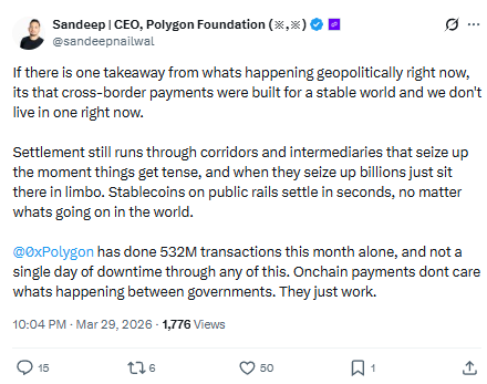 उनका कहना है कि geopolitical tensions के समय traditional सिस्टम फेल हो जाते हैं, जबकि Blockchain और stablecoins पर आधारित onchain payments बिना रुके काम करते हैं। इस बयान के साथ Polygon की real-world utility और भी ज्यादा highlight हो गई है।
