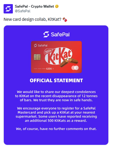 इसी पर प्रतिक्रिया देते हुए SafePal ने कहा कि उन्हें “KitKat bars के गायब होने का दुख है, लेकिन भरोसा है कि वे अब safe hands में हैं।” यहां “safe hands” शब्द का इस्तेमाल बहुत चतुराई से किया गया—एक तरफ सुरक्षा का मतलब, और दूसरी तरफ SafePal ब्रांड की ओर इशारा।