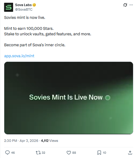 Sovies mint करने पर यूजर्स को तुरंत 100,000 Stars मिलते हैं, जो Sova ecosystem का reward सिस्टम है। ये Stars भविष्य के rewards, airdrops और अन्य perks के लिए उपयोग किए जा सकते हैं।