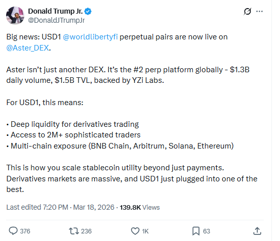 Crypto derivatives space में एक बड़ा अपडेट सामने आया है। USD1 अब officially Aster DEX पर perpetual trading pairs के साथ live हो चुका है। इस development की जानकारी Donald Trump Jr. ने X (Twitter) पर शेयर की, जिसके बाद crypto community में इसे लेकर काफी चर्चा शुरू हो गई है।